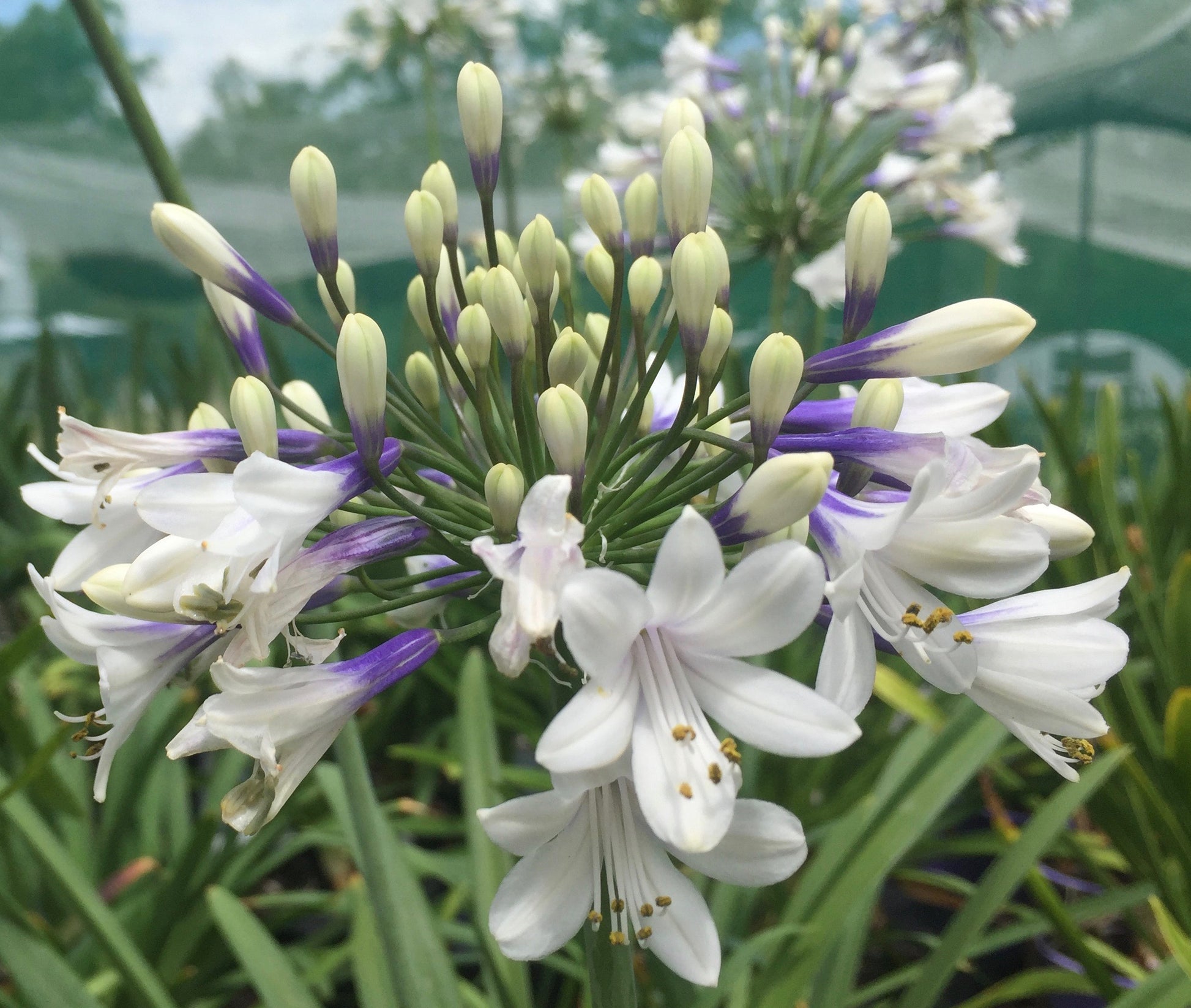 NEW RELEASE Agapanthus PMB030 AlexisTM is an exciting new evergreen bicolour dark blue and white flowering agapanthus bred by Pine Mountain Botanics Pty Ltd. It flowers readily in a 140mm pot with maximum impact. These plants are grown from tissue culture to ensure uniformity and stability of flowering. AlexisTM has very low seed set. The plants being offered are being grown in 140mm pots. See the attached foliage picture together with the flower of AlexisTM.