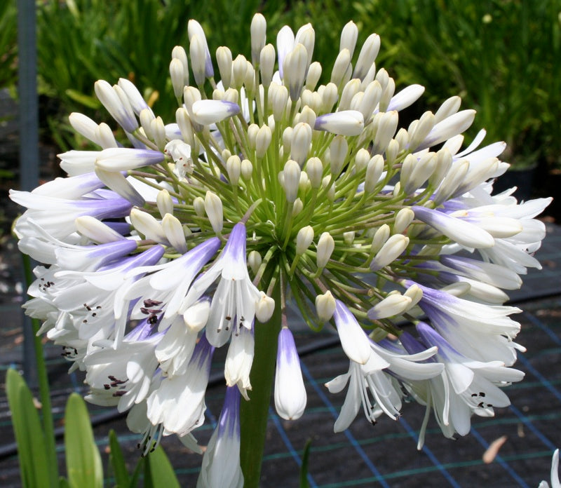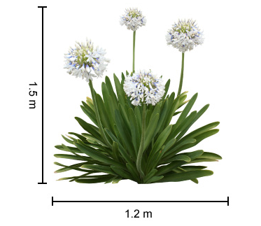 Bicolour violet blue and white flowers on long stems to 1.2m high. It is a late flowering agapanthus, flowering over the festive season (December into late January). Best planted in full sun to bring out the flower colour intensity. |