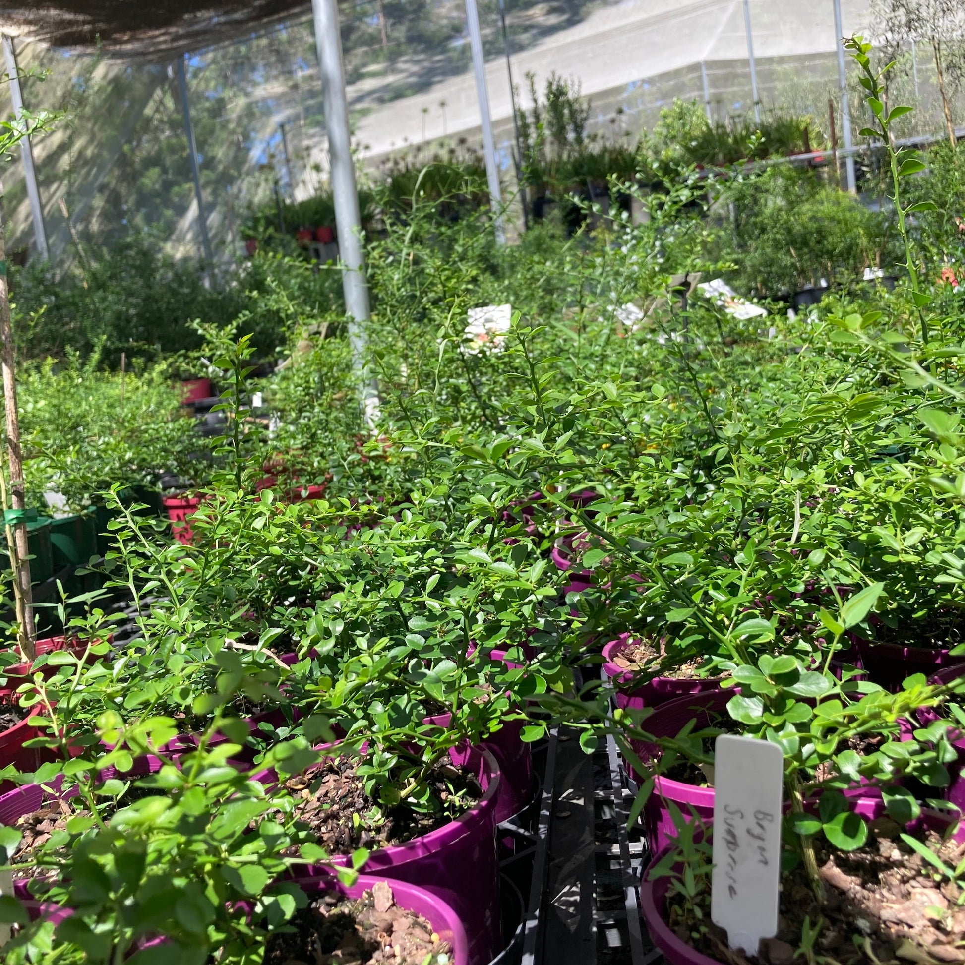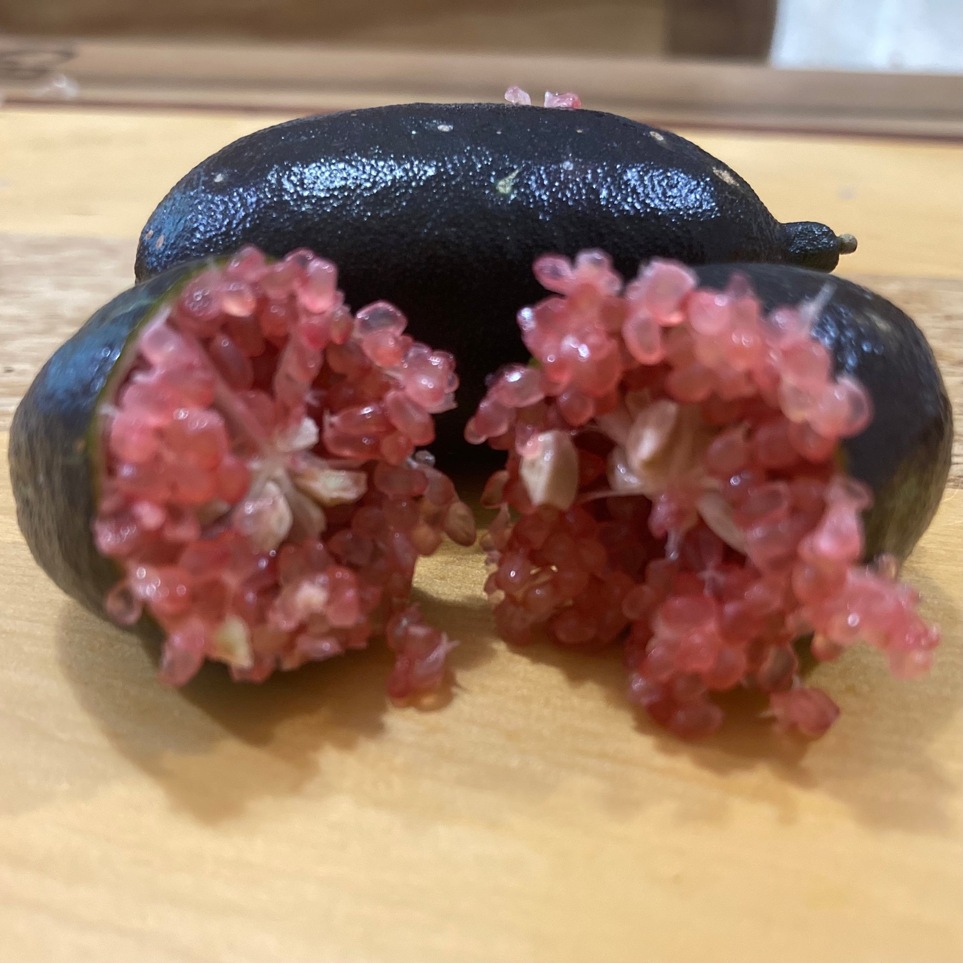 Byron sunrise is a slender compact tree growing 2 metres in height and 1 metre across. Ideal for small gardens, pots and containers. This dark-skinned finger lime holds tangy light pink coloured citrus pearls that darken to a deep red and strengthen in flavour when the fruit is cut. Plant in a sunny warm position, protected from harsh winds and keep the water and fertiliser up over the warmer months. Fruiting season from March to end April. These plants are cutting grown and will fruit this year. Seed grown will not be true to type. Grown in a 140mm pot. Fruit size is 60 to 90mm long. If grown in pots they may grow to 1.6m in height. Pick up only.