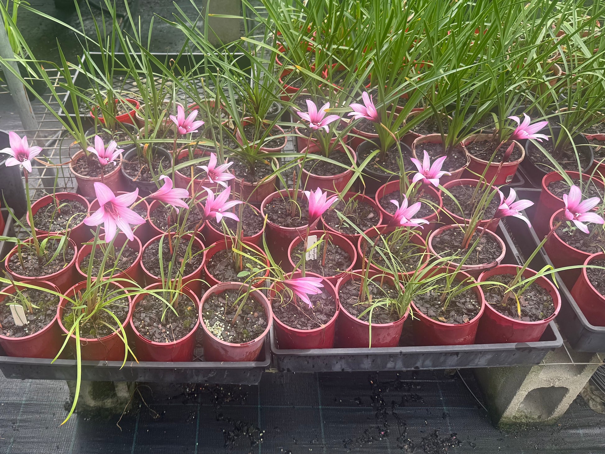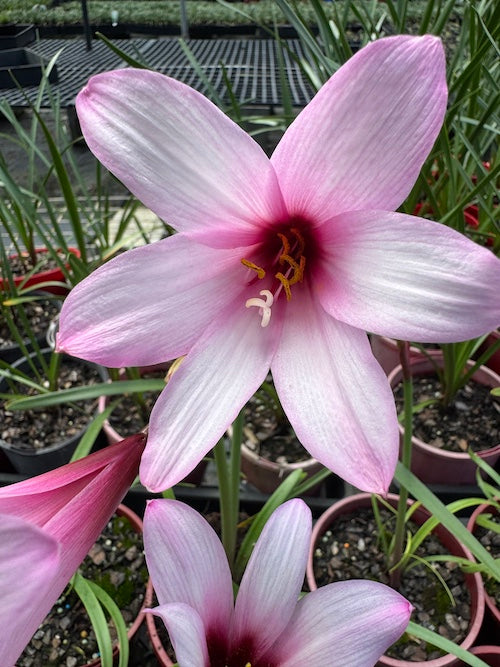 Habranthus brachyandrus jumbo rain lily has trumpet-shaped flowers, 6 petals, large pink-purple flowers with attractive dark throats. Like most rain lilies it tends to flower after rain. The price is for a flowered bulb. As this cultivar is relatively rare and has taken many years to propagate there is a limit of 3 bulbs per order.