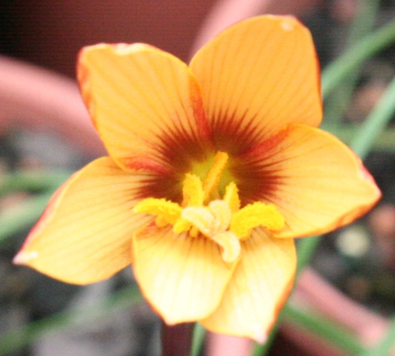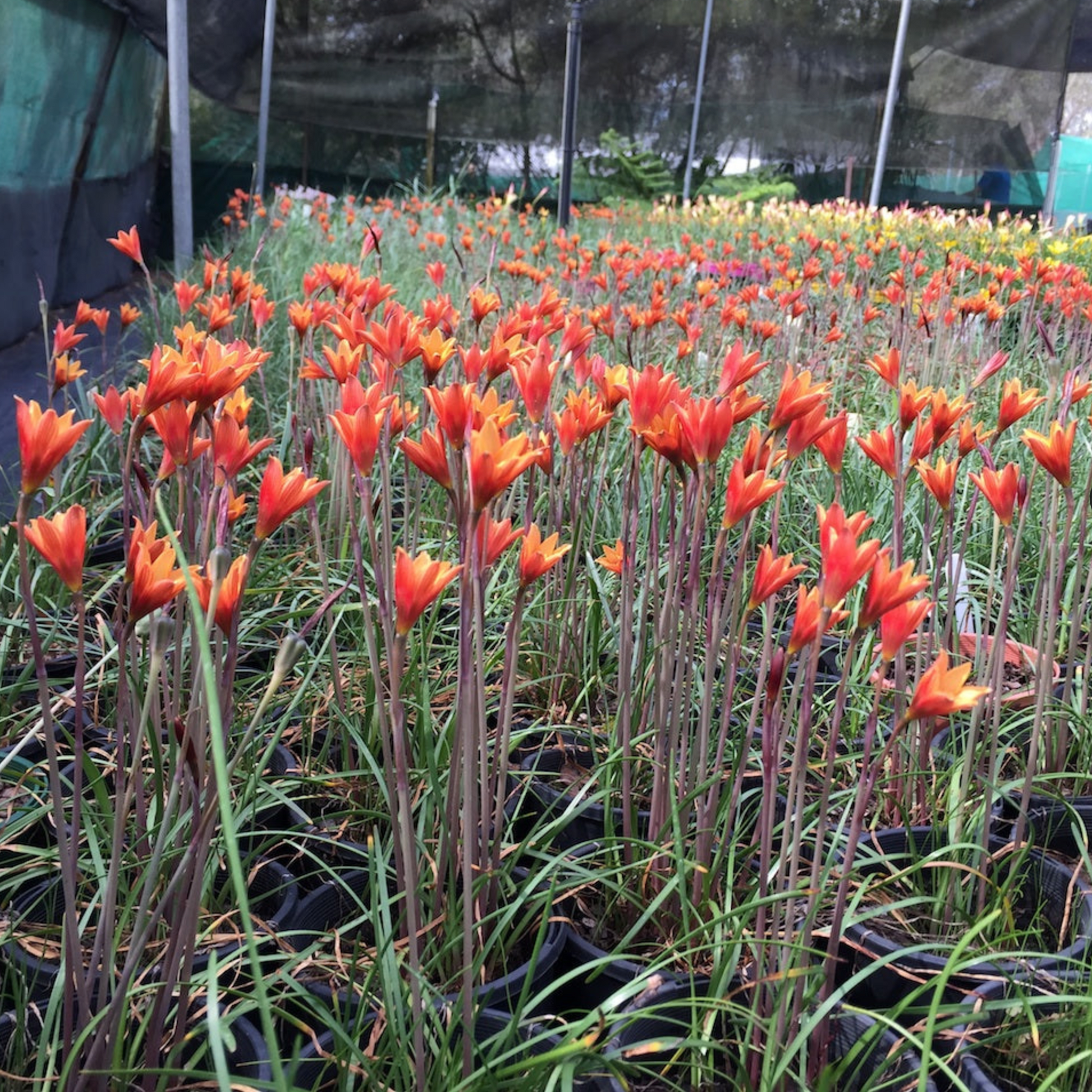 These attractive bulbs from tropical and semi tropical areas of the Americas have 10cm bronze to orange funnel-shaped flowers, striped darker underneath. There are numerous local forms of it in Brazil and Argentina. They are perfect for a well-drained rockery where they form nice clumps which then produce a steady flow of blooms over a long period, from mid Spring to late Summer. They often flower a few days after rain periods. Full sun is ideal. The price is for 10 flowering size bulbs.
