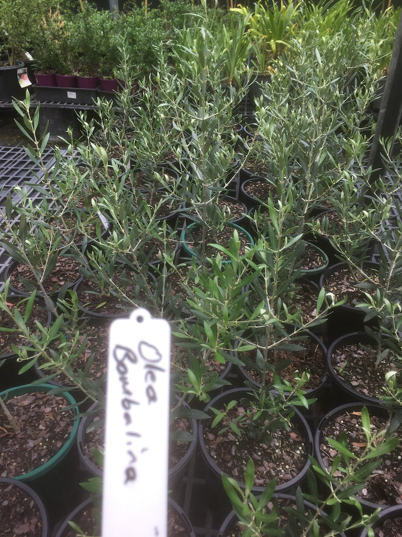 Olive Bambalina is a compact, low maintenance shrub, ideally suited for hedging or used for an espalier. It naturally grows to around one quarter of the usual size for olive trees. Very few, if any fruit are formed making it a popular choice for small hedges and feature pots. The leaves are smaller and internodes are reduced when compared to other olive trees.